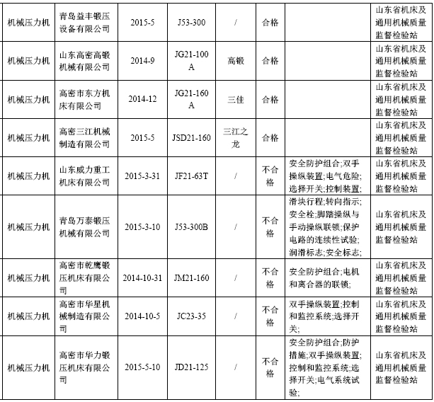 13日,山東省質(zhì)量技術(shù)監(jiān)督局在其官網(wǎng)公布2015年第2批機(jī)械壓力機(jī)產(chǎn)品質(zhì)量省監(jiān)督抽查結(jié)果,有5家企業(yè)的5批次產(chǎn)品不符合相關(guān)標(biāo)準(zhǔn)的要求。